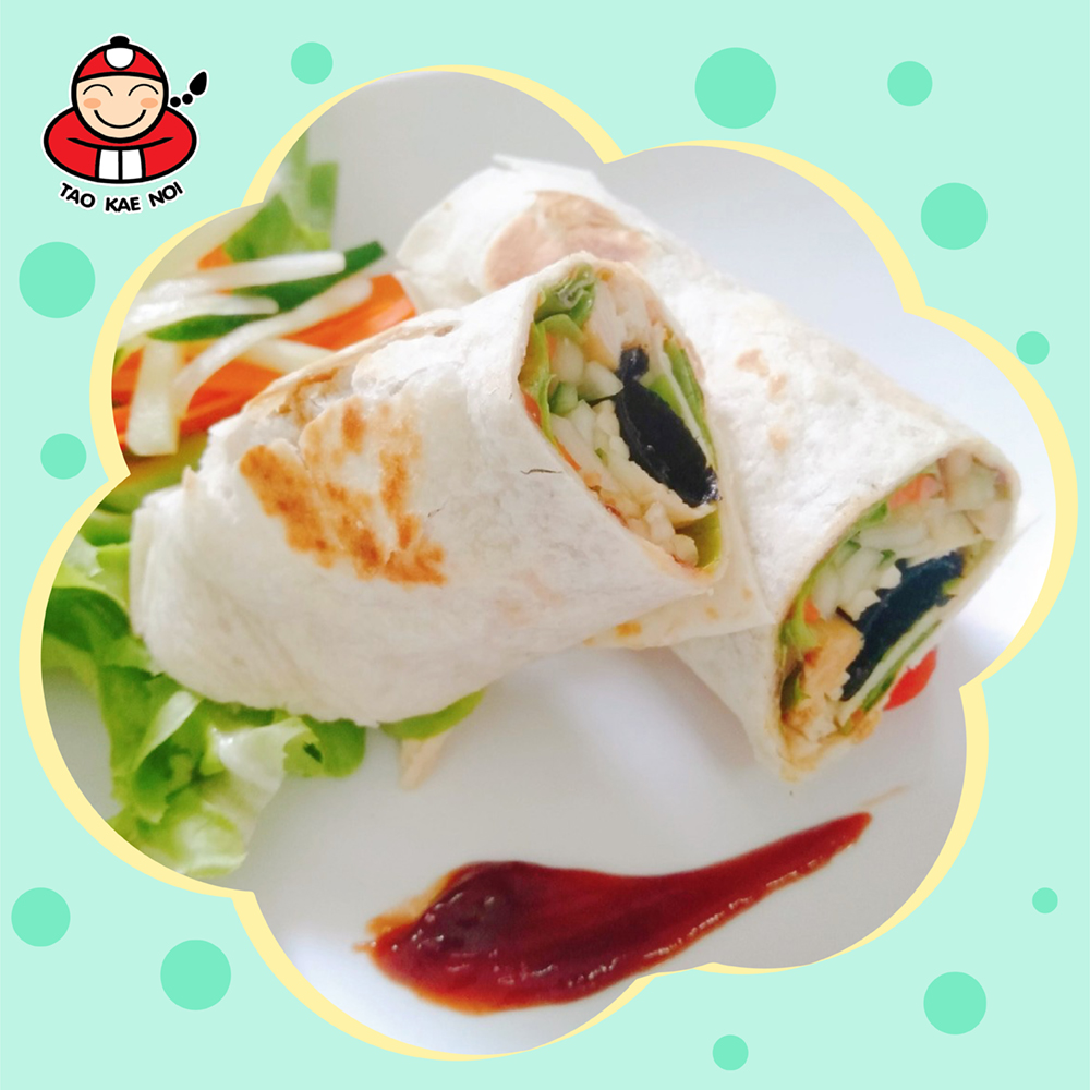 4. Prepare the cooked tortillas, apply the tomato sauce around the whole piece. Then, put the green oak, carrots, cucumbers, Taokaenoi big roll and chicken on the tortillas.